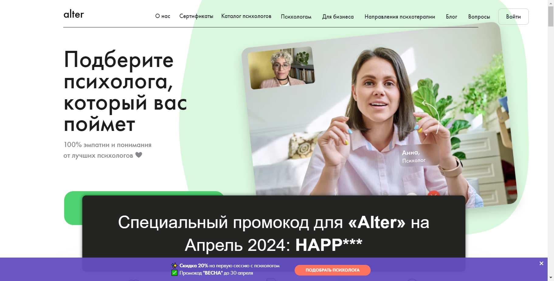 - ВЕСНА - Психологическая сессия со скидкой 20% по весеннему промокоду! Действует по этой ссылке