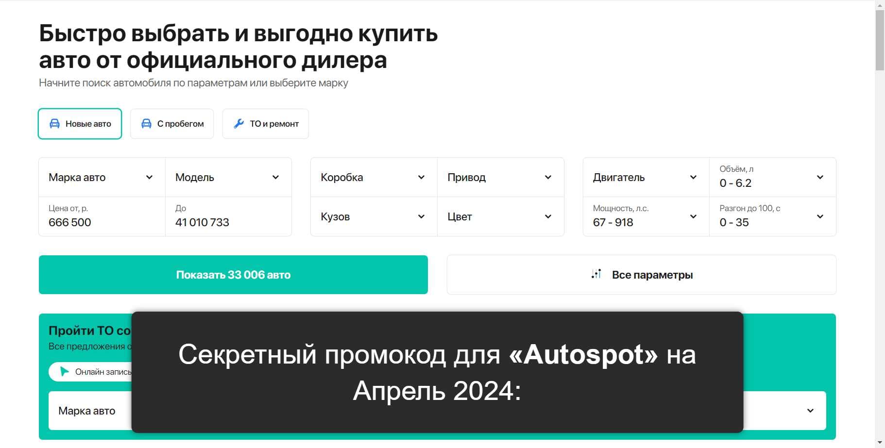 Найти рабочий промокод на скидку в «Autospot» на апрель 2024 года не составит труда, если знать, где искать. Прежде всего, следует обратить внимание на официальный сайт компании, где часто публикуются актуальные промокоды и акции. В разделе специальных предложений вы найдете все доступные варианты скидок, которые можно применить при покупке нового автомобиля.