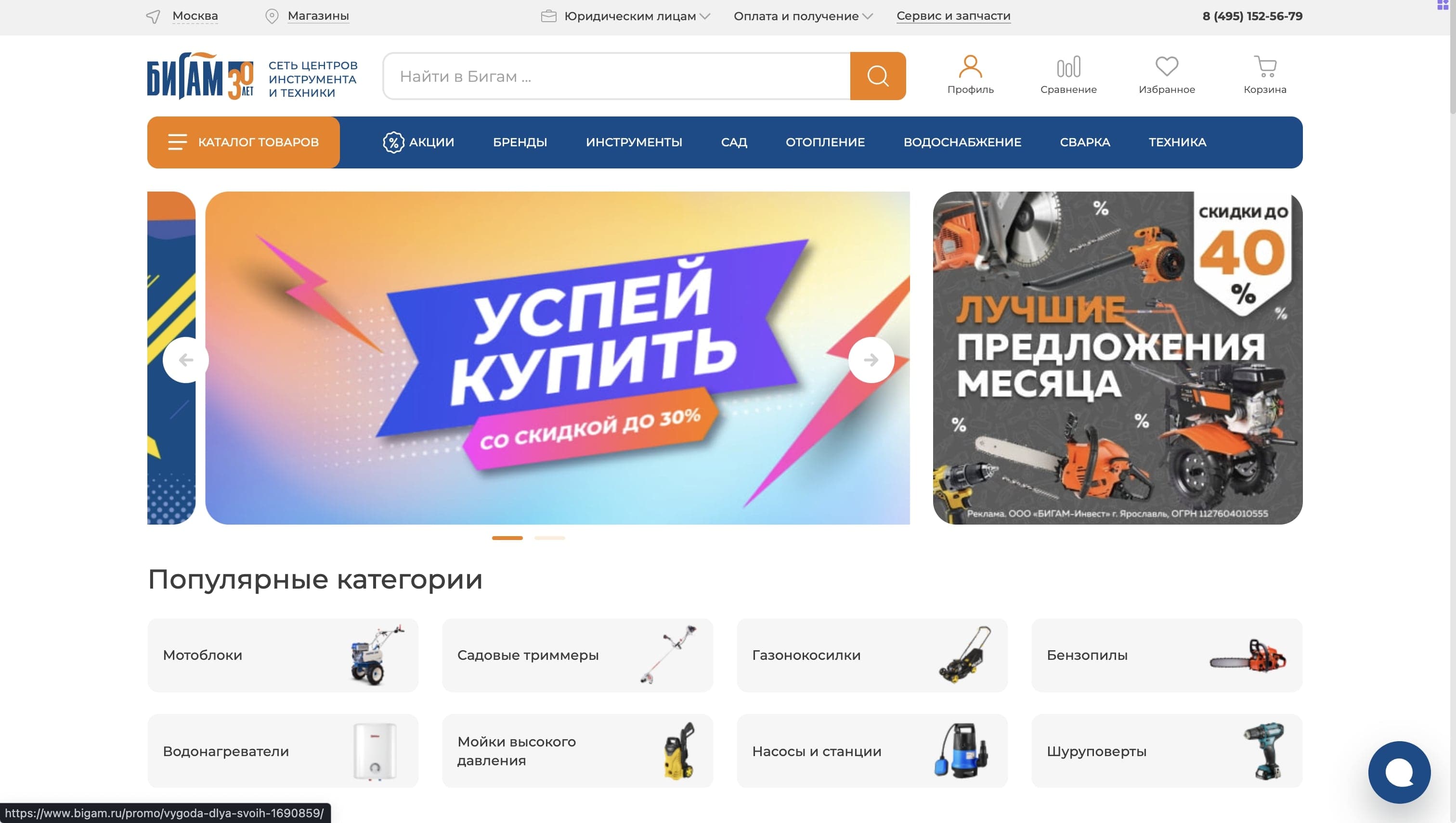 Интернет-магазин "Бигам" - это надежный партнер для всех, кто ценит качественный инструмент и оборудование. Более 28 лет компания успешно работает на российском рынке, предлагая широкий ассортимент электроинструмента, строительной техники и оборудования для сада.