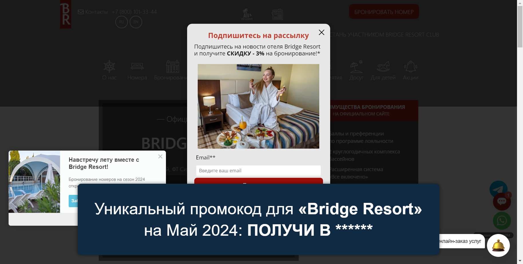 Еще больше выгодных промокодов для «Bridge Resort» на Май 2024 на Сайте