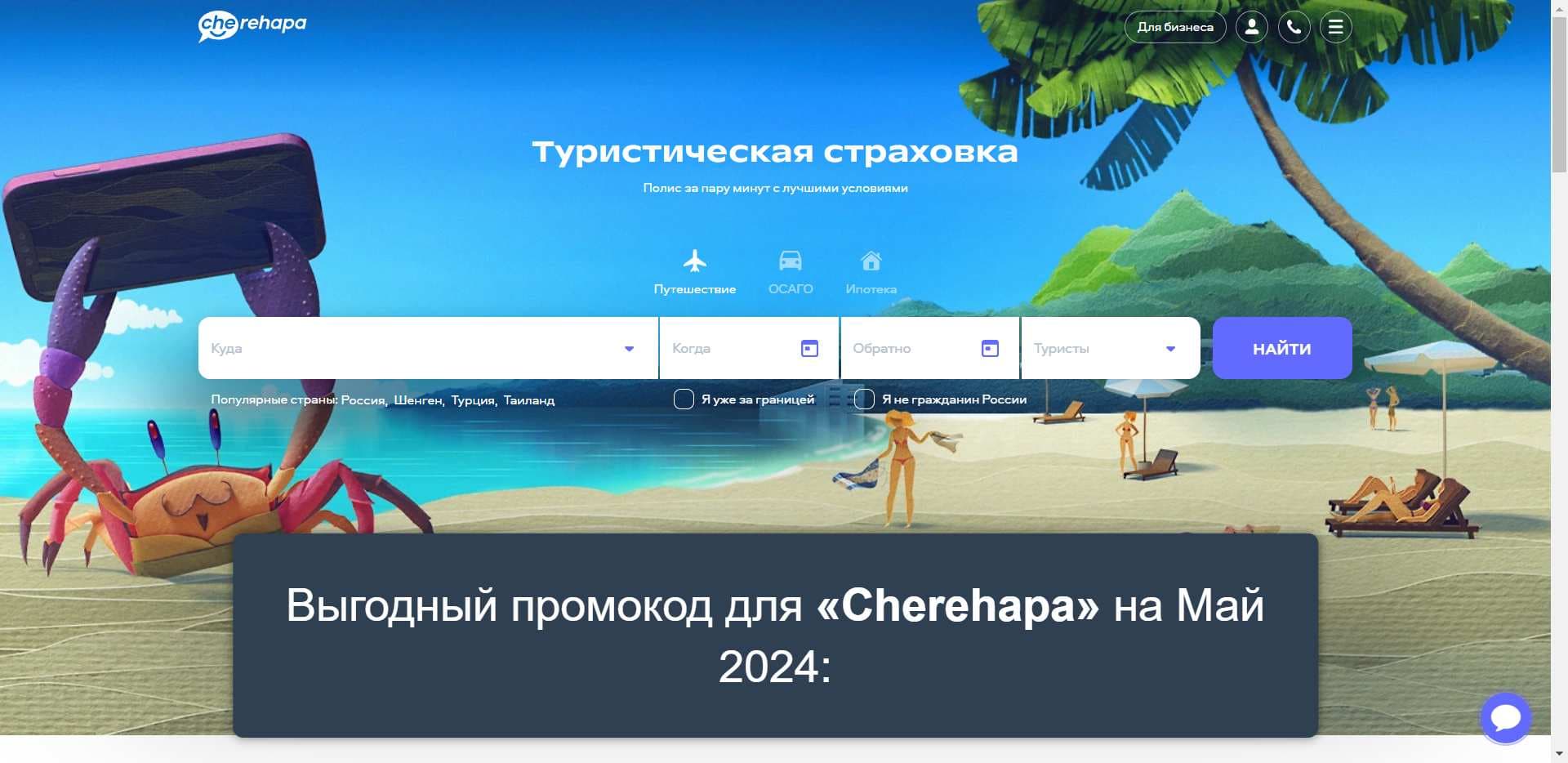 "Использовал услуги Cherehapa для оформления страховки путешественников. Очень удобный и интуитивно понятный интерфейс сайта. Промокод из статьи помог сэкономить немного денег. Но стоит улучшить информацию о дополнительных услугах и возможностях страхования для более полного понимания клиентами."